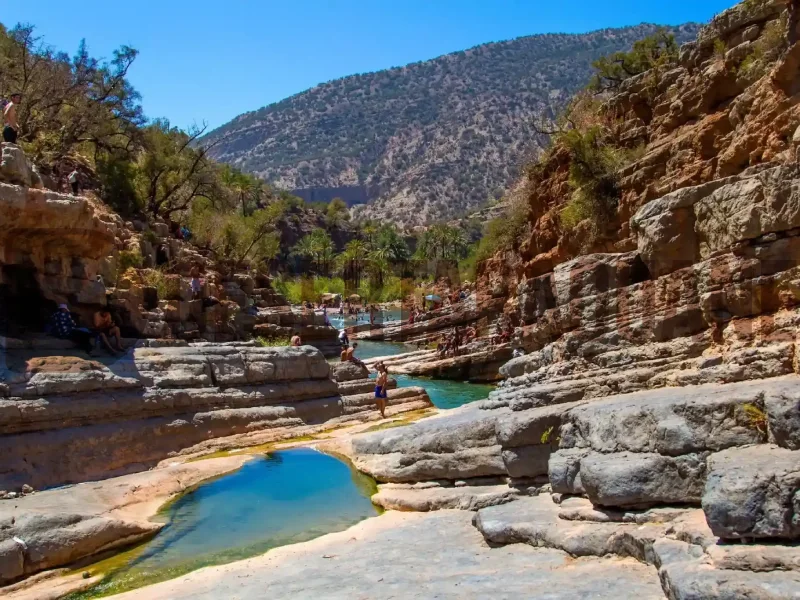08:00 Depart Agadir from hotel 10:00 Arrive in Imouzzer Ida Ou Tanane; short orientation walk in village; explore local shops / cafés 11:00 Visit honey producers / local markets (if available) & argan cooperative 12:30 Lunch in Imouzzer (local restaurant) 13:30 Depart for Paradise Valley; drive through mountain roads with photo stops 14:30 – 16:30 Time in Paradise Valley: swim in natural pools, relax, short hikes, river walks 17:00 Drive to lodging (hotel or guesthouse) near Paradise Valley or back toward Agadir area depending lodging choice 19:30 Dinner and overnight stay